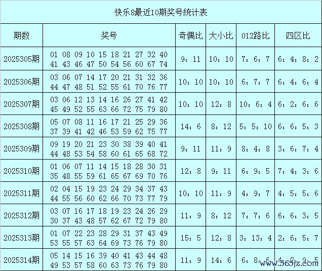 福彩高慢8第2025314期开出奖号:05 14 15 16 39 40 41 43 44 48 49 53 57 58 60 63 73 76 79 80,其中奖号奇偶比为11:9,大小比为14:6,012路比为6:8:6,四区比为4:2:9:5。